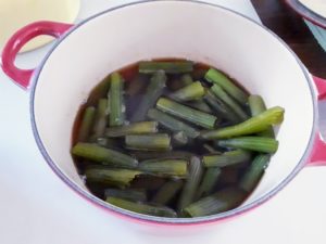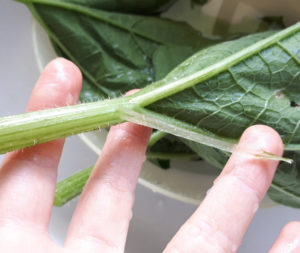 蒸して葉の全体にあるとげとげした小さな毛を柔らかく?させます。