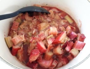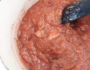 ② 鍋のふたをしてから15分程でルバーブから水分が出てきて少しずつ柔らかくなっていきます。