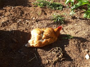 今日のブリスベンは気持ちよく晴れました。砂浴びをする我が家のニワトリ(もう一羽います)。ガーデンベッドの土には、この方のう〇ちも入れています。栄養満点。