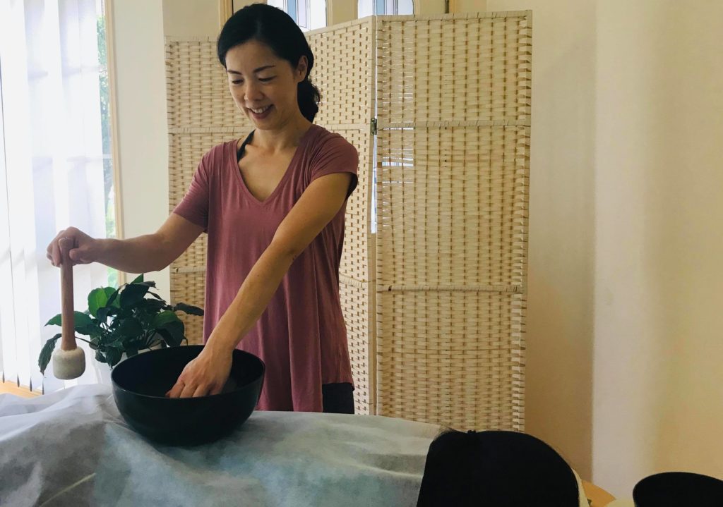 リストラティブヨガのポーズには、身体の特定の箇所を緩める、優しく開く(ストレッチとは異なります)などの目的と効果があるので、シンギング・リン®でその効果をさらに高めるようにしています。