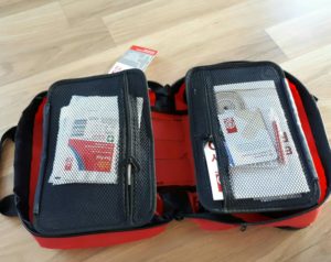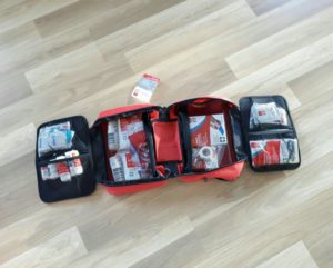 中身は絆創膏、包帯、消毒液、手袋、防寒具、冷却剤、ハサミ、ピンセットなどなど全部で135アイテム。