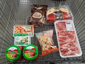 先日のお買い物はこんな感じ。普通のスーパーマーケットサイズのトロリーでも足りてしまう量・・・