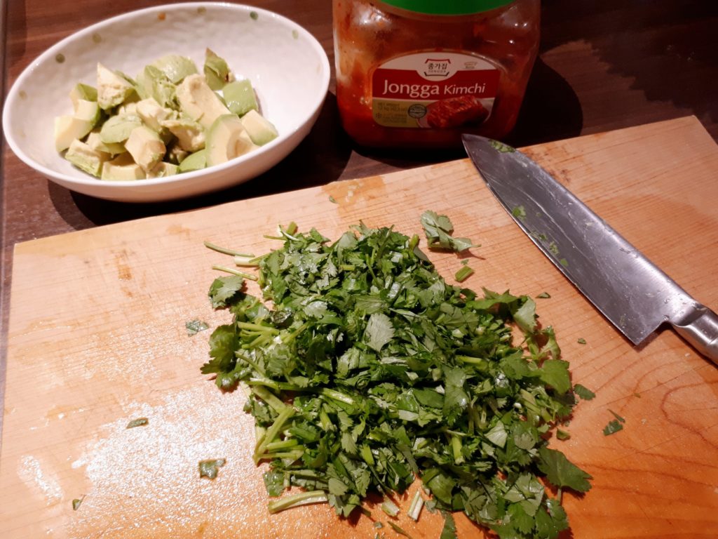 キムチ、程よい食べごろを迎えたアボカド、パクチーが同時にあるのは珍しいことなのでこの贅沢バージョンはレアです。アボカドは近所でひとつ39セントという破格の値段だった時にまとめ買いしたのでたっぷりと。ホントに美味しい・・・