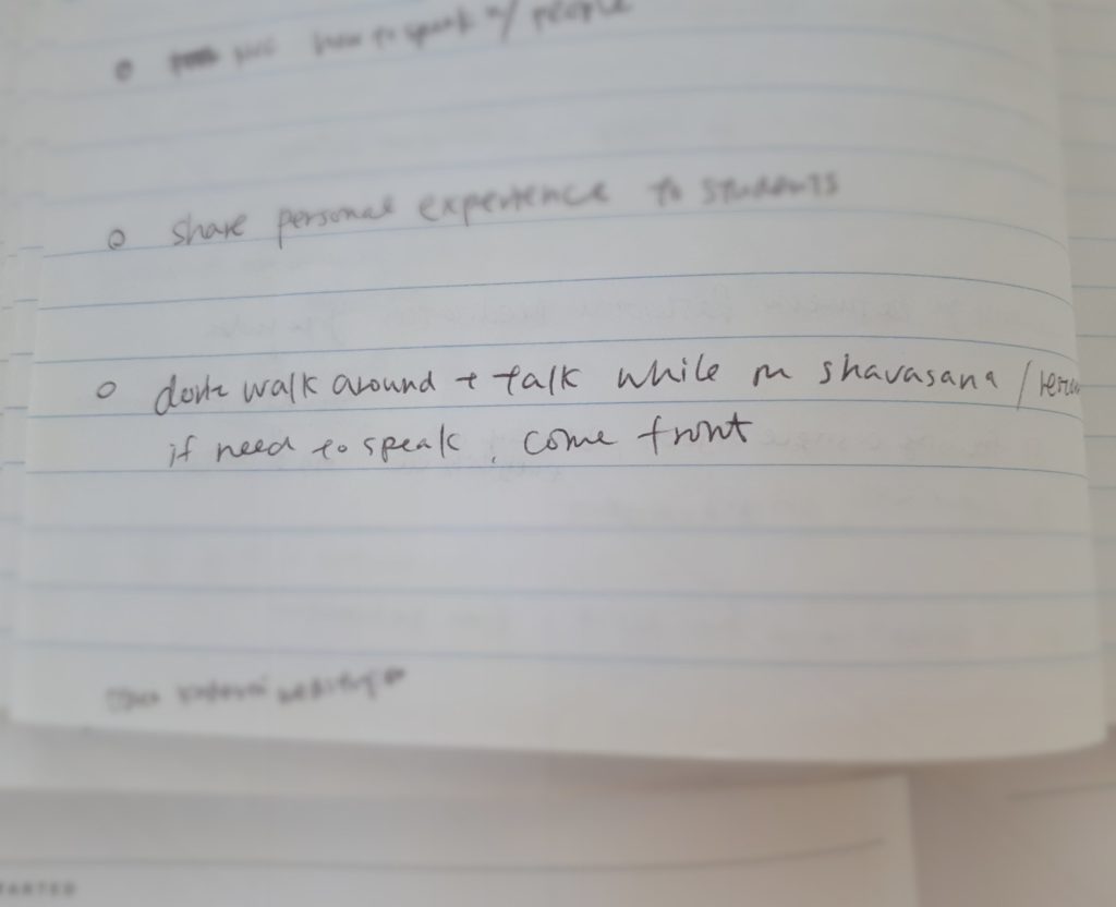 シャバアーサナの時や、リストラティブヨガのポーズの時に部屋を歩き回ってしゃべるのは控える。喋る必要があるなら前に来ること。