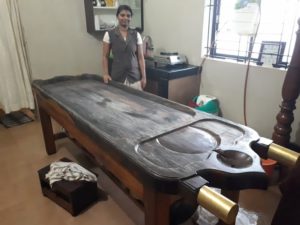 この木の固~~いベッドの上でふんどし姿になって頭からつま先までオイル(ゴマ油)まみれとなります。生暖かいオイルの温度がとても気持ち良いのです。