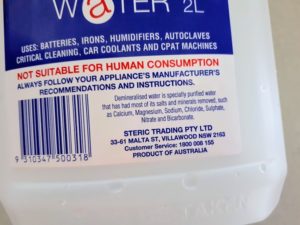 今使っているものも蒸留水だと思っていたら Demineralised Water(脱塩水・脱イオン水)でした。スーパーマーケットの Woolworths で購入したものです。蒸留水、精製水と何が違うのか調べてもよくわかりませんでした。というか、”調べる” というほど細かく追求していません。