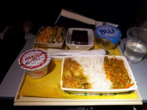 ついでに、ぼやけた画像ですが Jet Airwaysのシンガポール・インド(Bangarole / Bengaluru)間のベジタリアンミール。まさか明治のヨーグルトを食べられるとは。