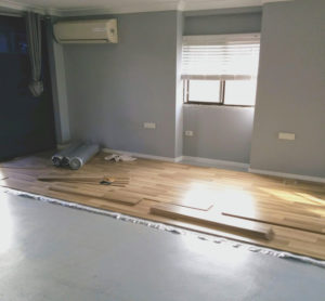 ロール状になっている緩衝材をカットしながら敷き、その上にフローリングをこれまたカットしながら敷き詰めました。