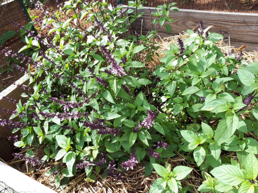 鉢植えのままでは全然大きくならなかった、ホーリーバジル。地植えにしたとたん急速に育っています。トゥルシー茶をつくるのが目標!